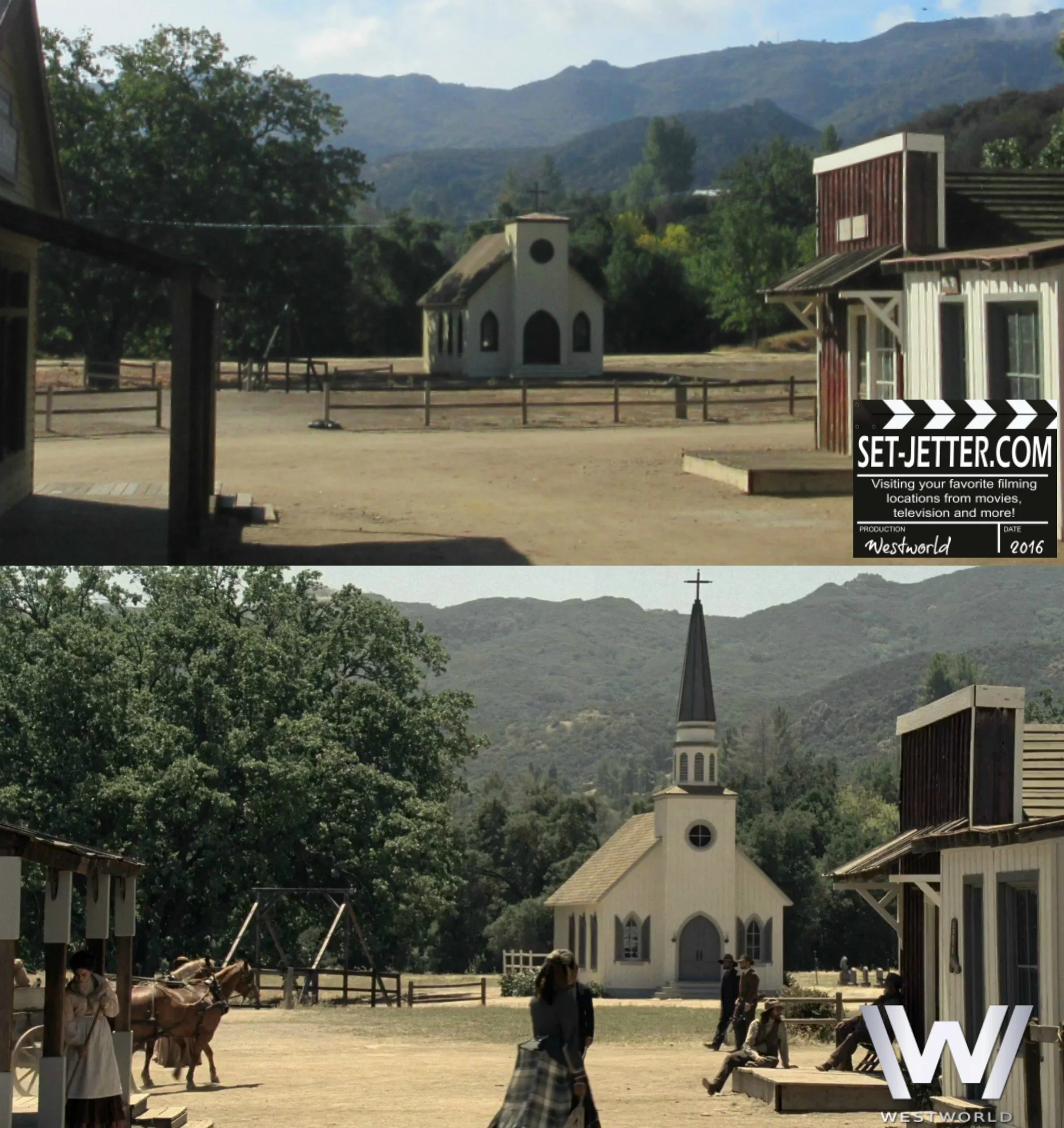 The church looks mostly the same except for the steeple created for the production. I did not include the graveside flashback as it might spoil it too much for some viewers to see whose grave Dolores is visiting.